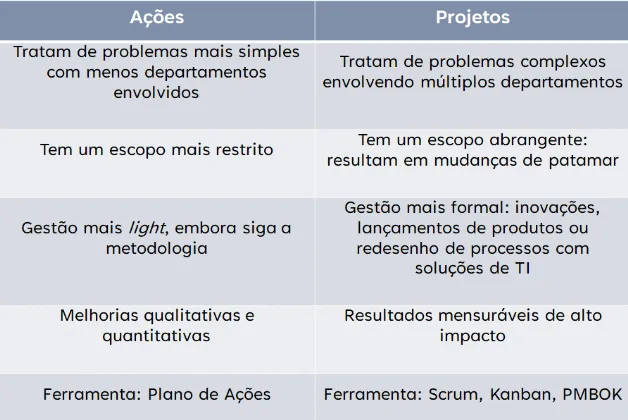 Sem ações e projetos as metas serão inalcançáveis. Planos de ação consistentes fundamentados nos objetivos e metas e projetos prioritários com responsáveis, prazos e custos bem definidos e controlados são a garantia do sucesso das metas. Abaixo as características de ações x projetos:
