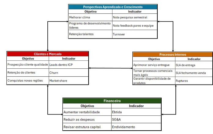 Devido a conexão dos objetivos de cada perspectiva com os indicadores, é possível ter uma quantidade equilibrada das métricas: nem o excesso e nem a escassez. Não podemos nos esquecer que a estratégia requer escolhas (tradeoffs). Nem sempre mais é melhor.